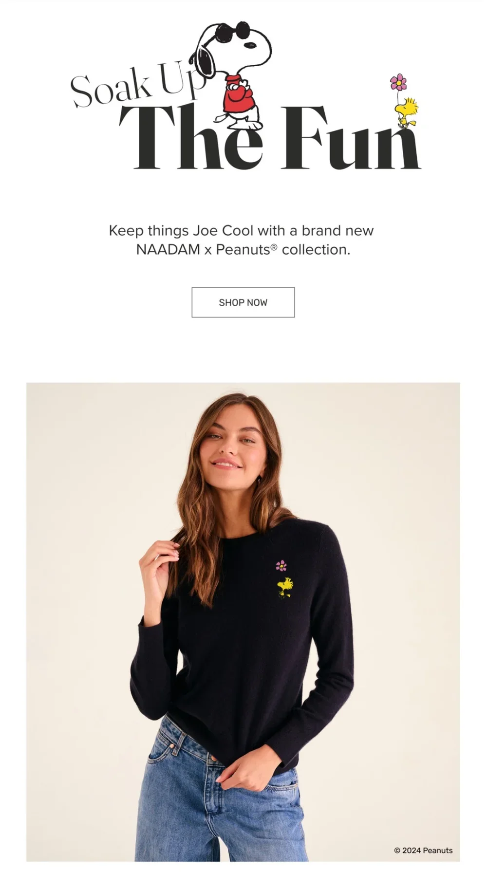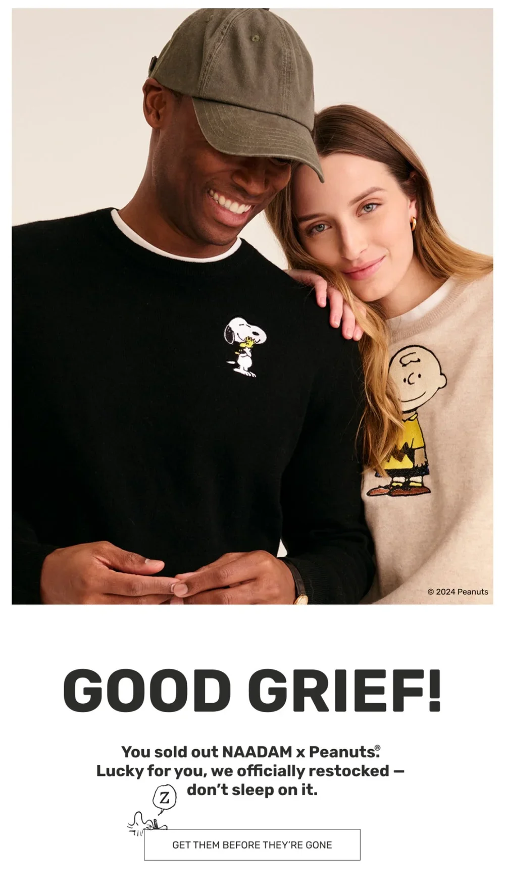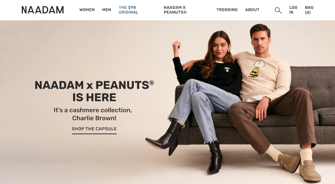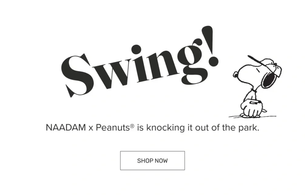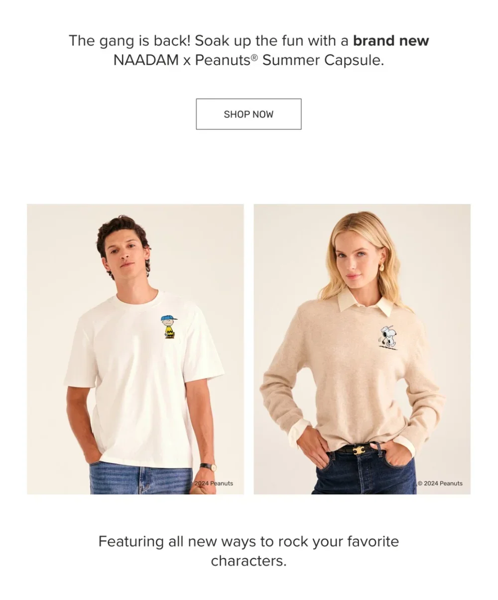 For their first-ever licensing collab, NAADAM teamed up with none other than the always-iconic Peanuts®. To launch these novelty knits, we paired cool, elevated styling with fun, nostalgic copy. The collection was so well received that our launch email generated $10k in sales within the first hour, and we sold out in a single day (good grief!). A few months later, we kept the party going with a limited edition NAADAM x Peanuts® Summer Capsule.