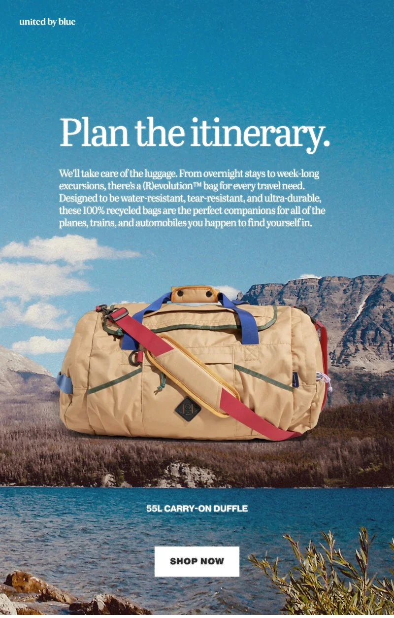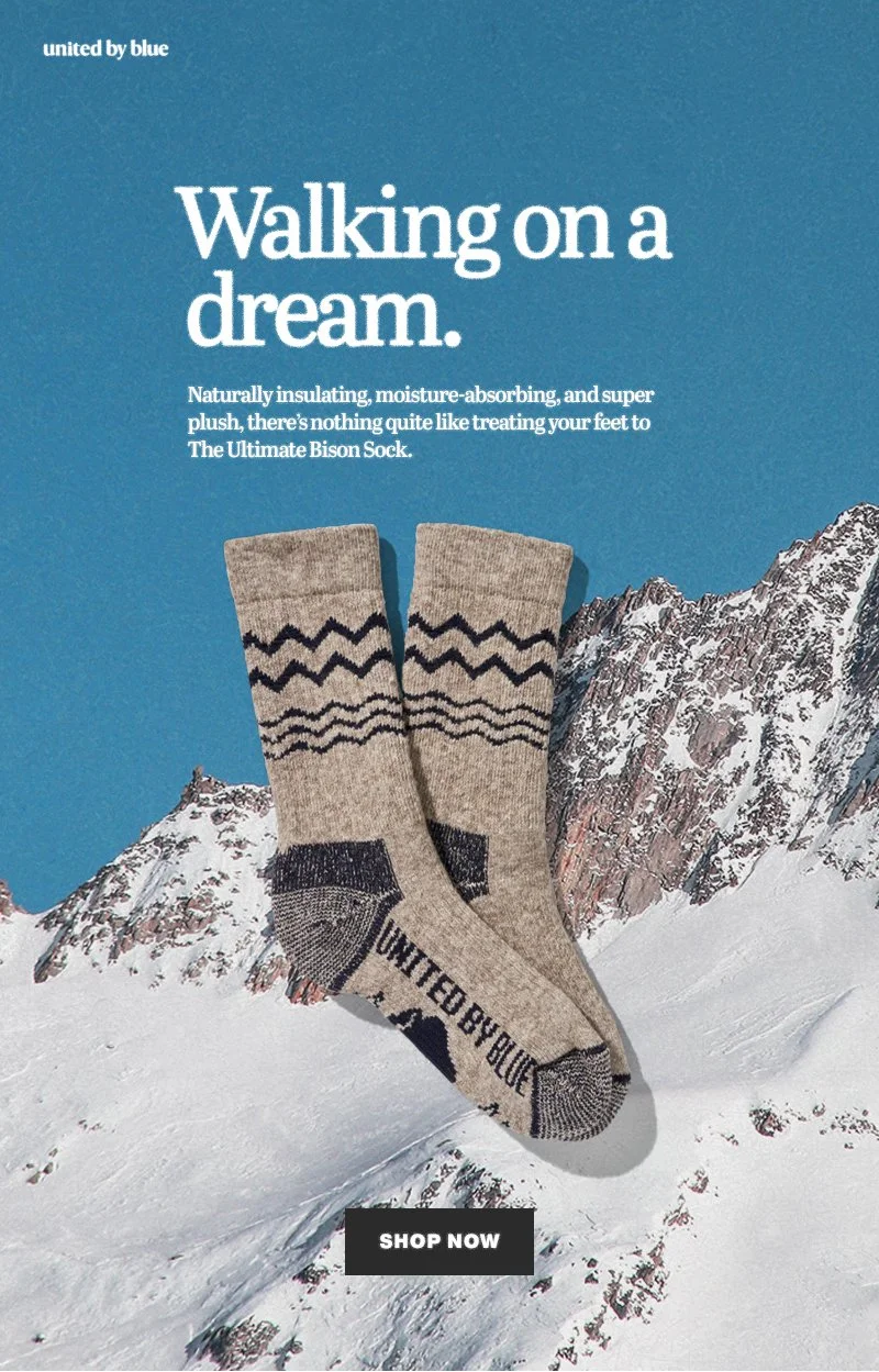 Feeling inspired by vintage National Geographic and the heritage style of the outdoor industry, United By Blue released a series of creative assets for email and social mimicking old-school magazine tears. Think grainy photographs, a solid paragraph of copy, and headlines with a certain kind of quip.